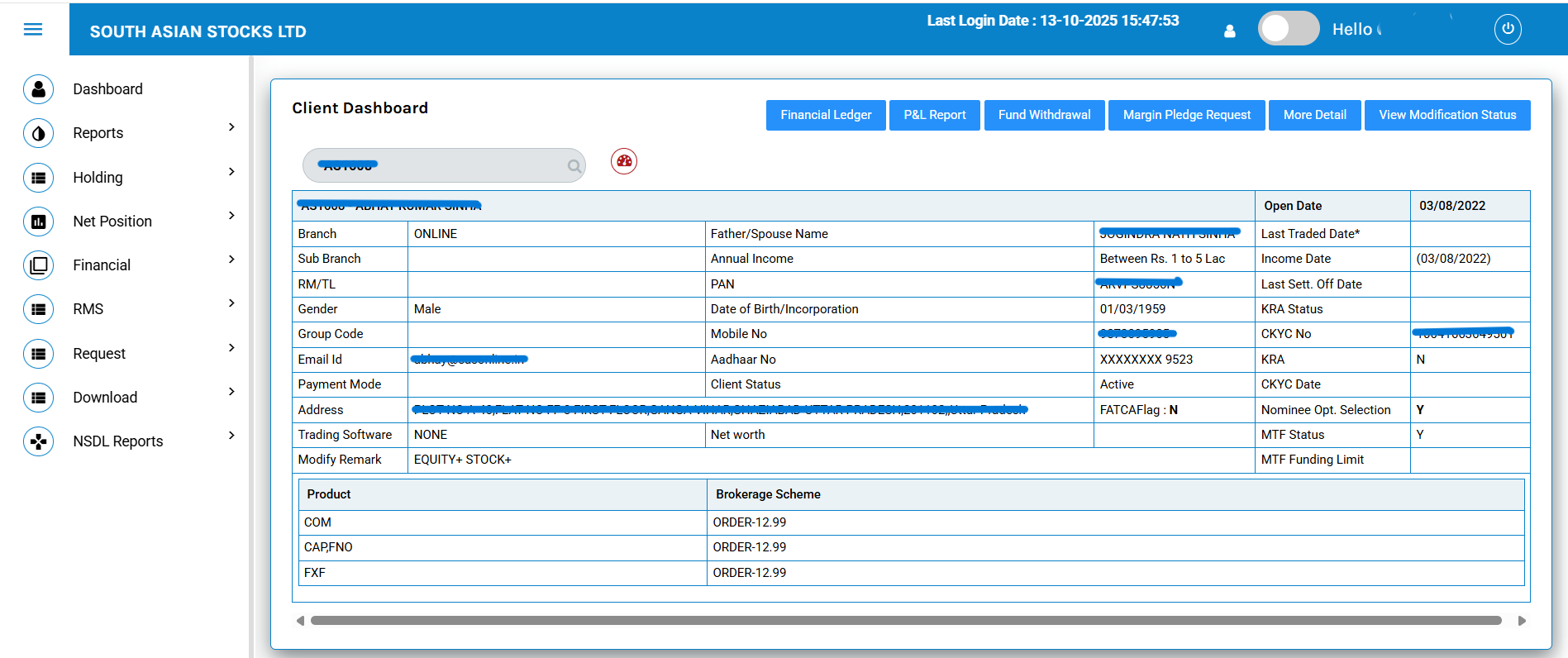 The Back Office Portal Dashboard provides a comprehensive summary of your Trading and Demat account. In a single view, you can check your financial balance, holdings, positions, and access many other options with just one click.