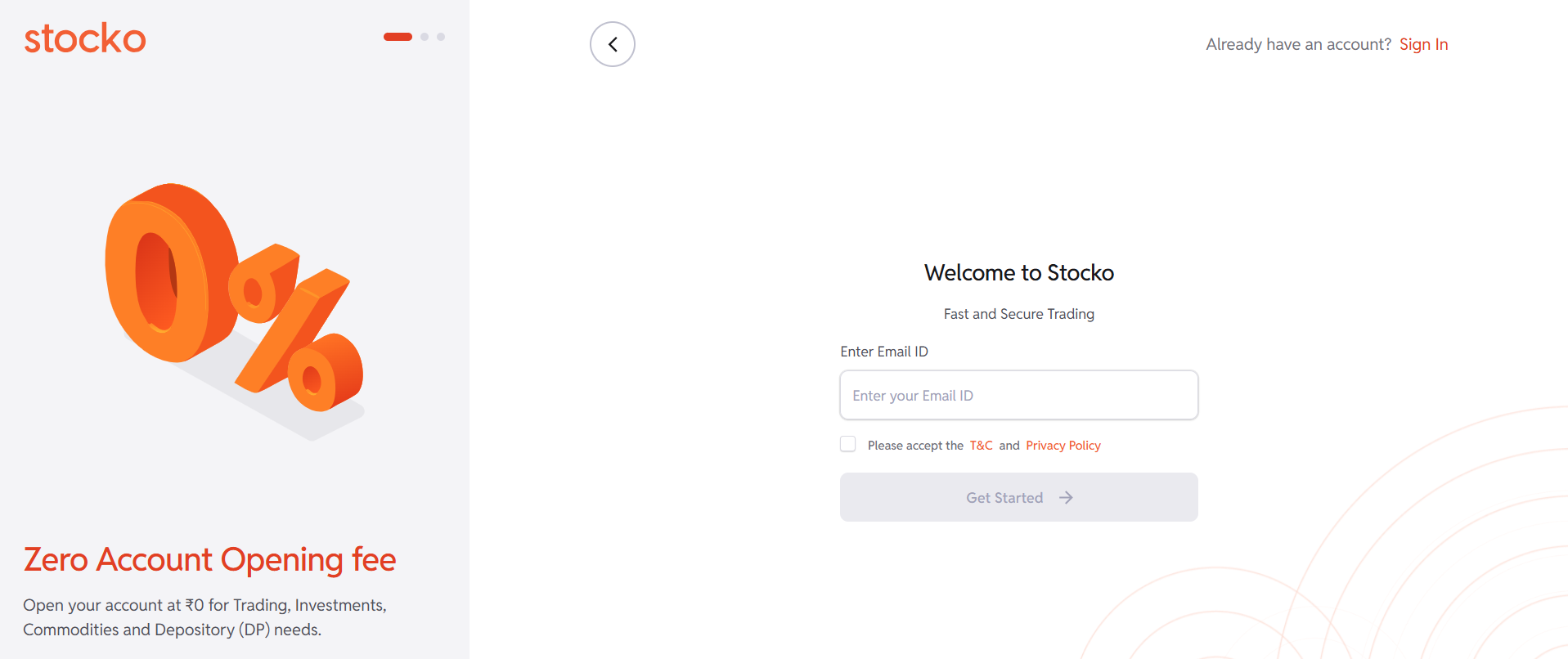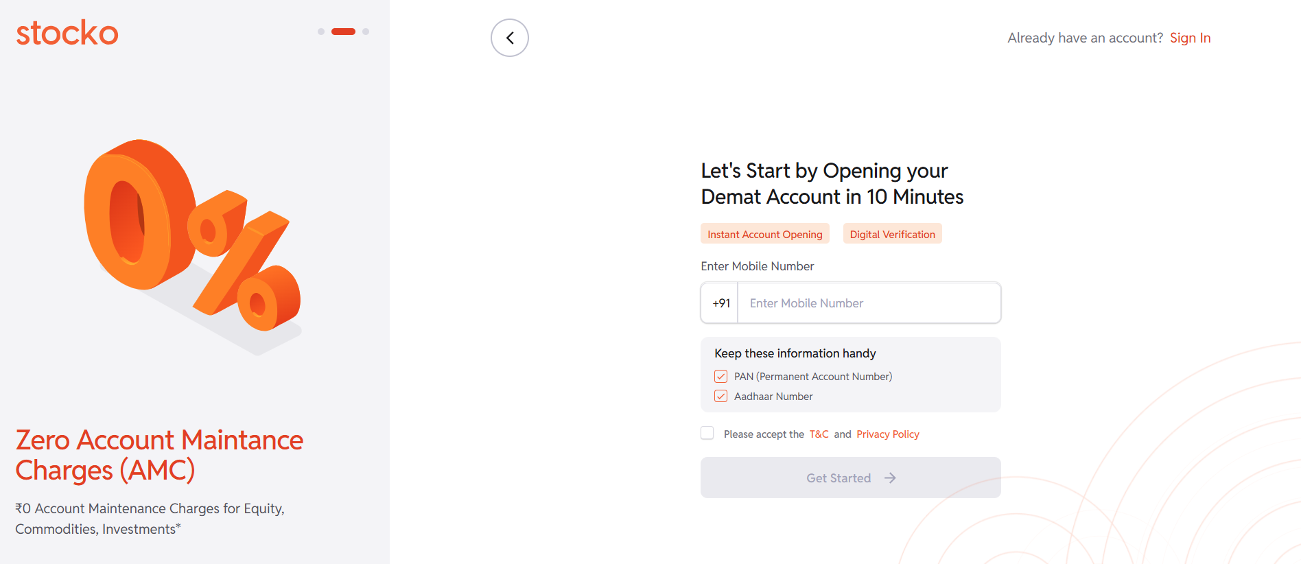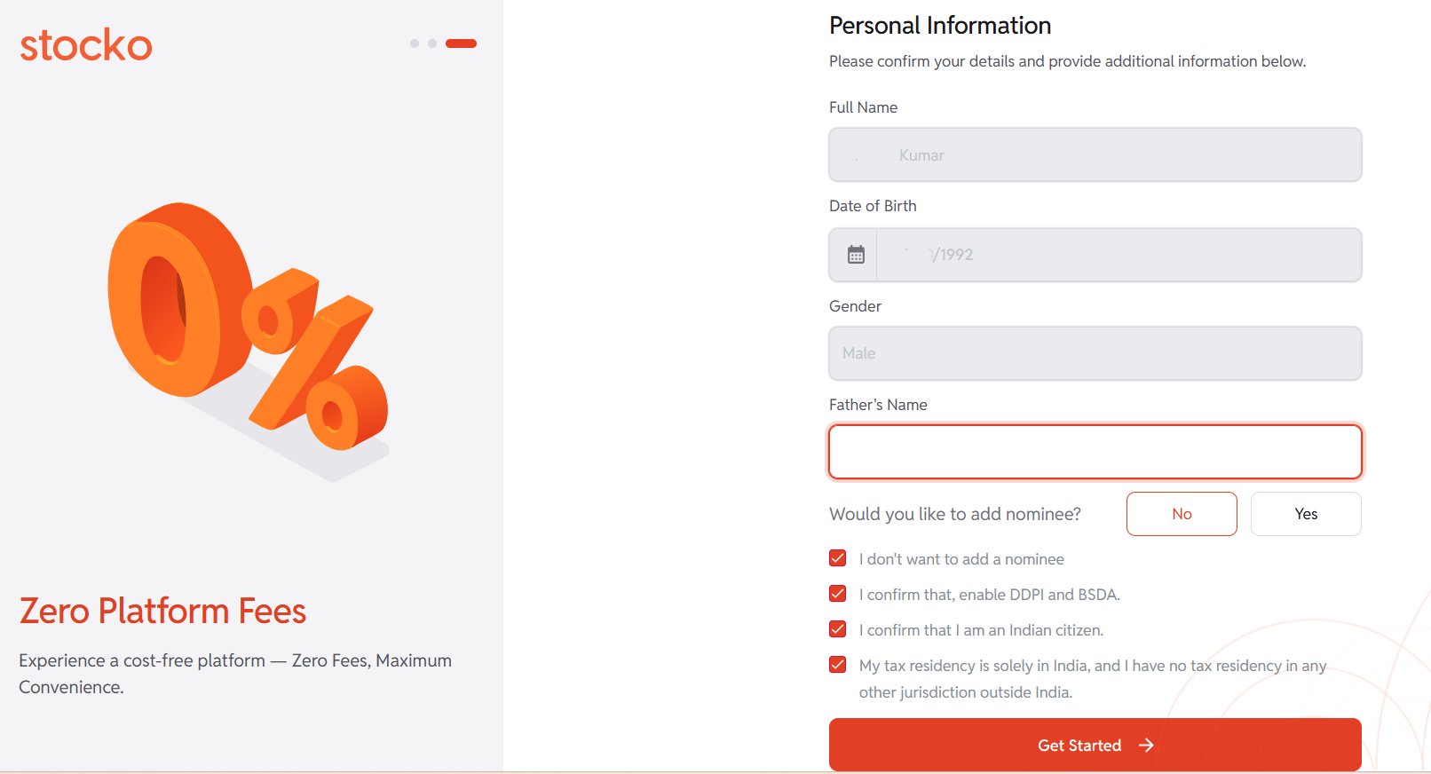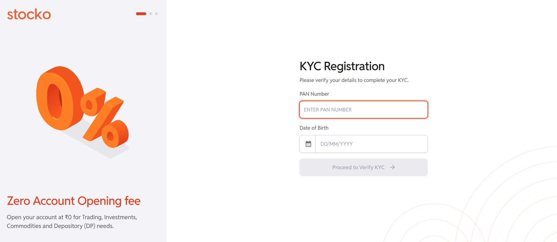 Opening an account with Stocko is a simple and paperless process. In these tech-savvy times, we have kept the procedure very simple and just a click away. For any assistance during the process, you can contact our sales team at +91-11-4040-9900. Kindly follow the steps mentioned below for detailed information on online account opening.